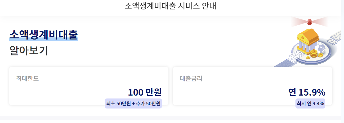 소액생계비대출은 취약계층을 위해 제공되는 정부지원 상품으로, 최대 100만 원까지 대출이 가능합니다. 연소득 3,500만 원 이하이면서 신용평점 하위 20% 이하인 분들이 대상이며, 대출 금액은 생계비 용도로만 사용 가능합니다. 대출 금리는 최저 9.4%이며, 최대 5년까지 대출 가능합니다.
