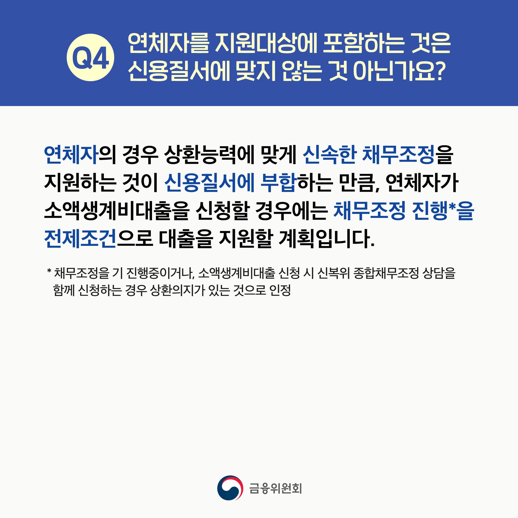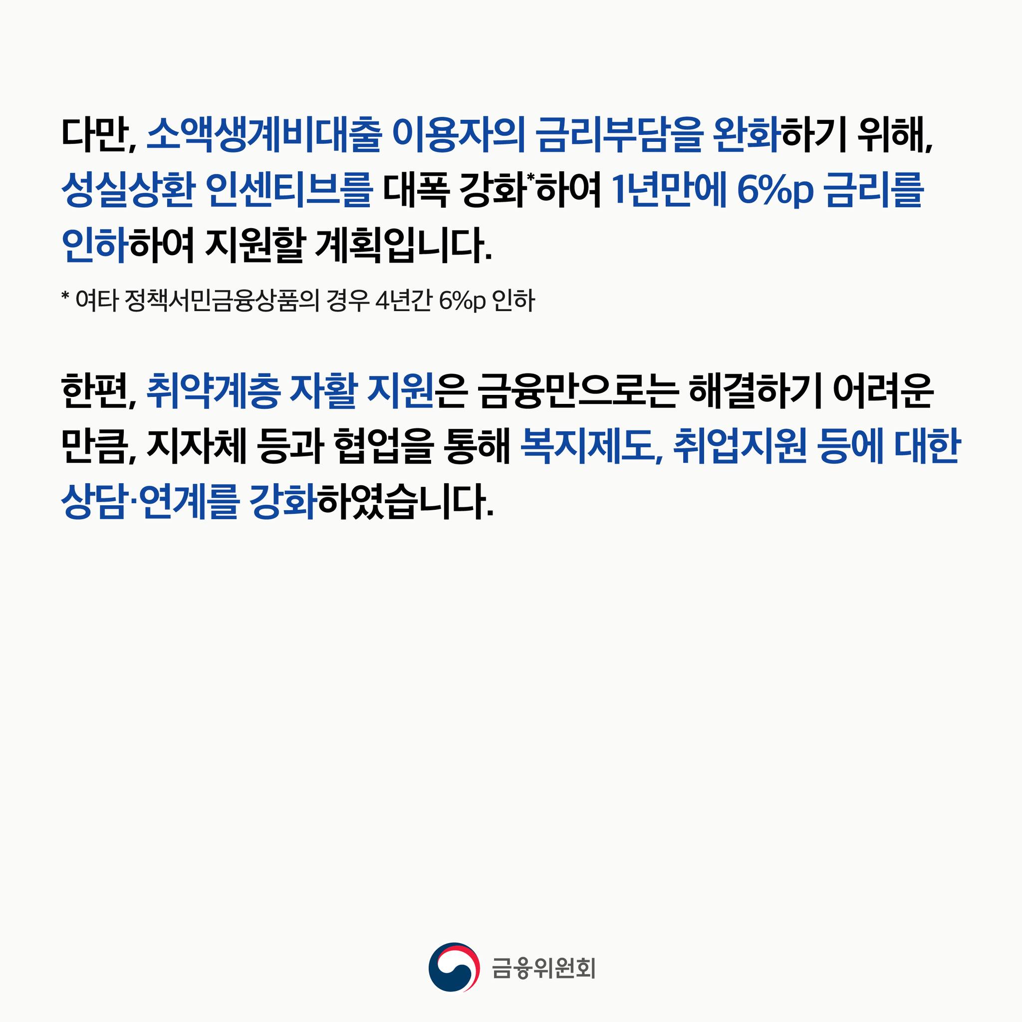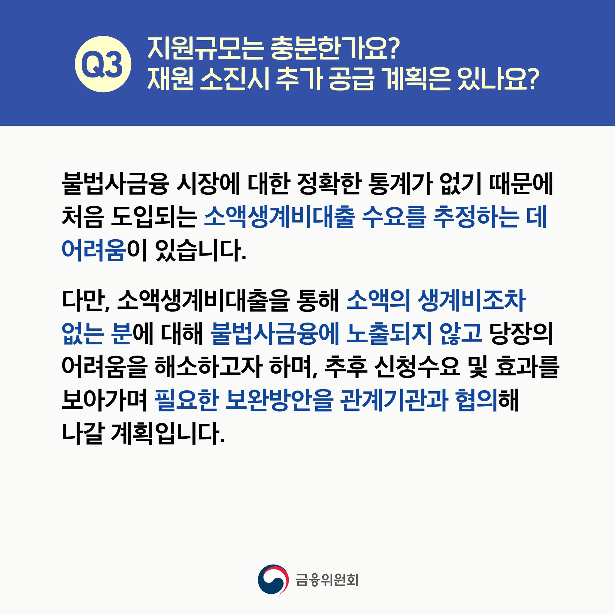 유재훈 금융위원회 금융소비자국장은 "소액생계비대출은 대출자들이 불법사금융에서 처음부터 큰돈을 빌리는 건 아니다"라 "소액으로 빌리다가 갚지 못하면서 피해가 커지는 만큼, 처음부터 불법으로 넘어가는 일을 방지하기 위해 소액으로 시작한다"고 설명했다. 이어 "본인이 채무 조정을 받을 수 있다는 사실도 모르는 이들이 있다"며 "이런 차주에게 상담 통해 채무 조정을 받게 해주고 복제 제도도 안내해주려는 것도 소액생계비대출 제도의 목적 중 하나"라고 강조했습니다.