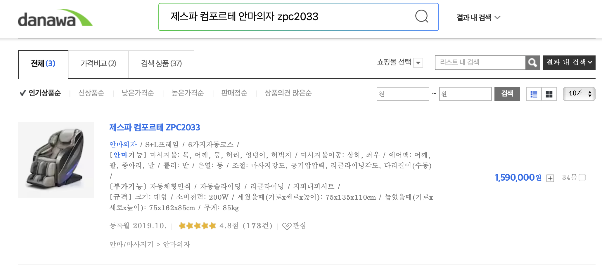 제스파 컴포르테 안마의자 zpc2033은 다나와에서 현재 159만원대로 판매 중입니다. 이 가격대에서는 대개 저렴한 안마의자들이 많이 판매되고 있는데, 이 제품은 프리미엄급 안마의자의 기능과 성능을 모두 갖추고 있습니다. 안마의자 시장의 가격 파괴 선봉장이라고 할 수 있습니다. 비슷한 기능을 가진 다른 브랜드의 안마의자들은 300만원 이상에 판매되고 있지만, 이 제품은 그보다 절반 가까이 저렴하게 구매할 수 있습니다. 이 제품은 가성비가 매우 뛰어나기 때문에 가성비를 중요하게 생각하는 분들께는 최적의 선택이 될 것입니다. 이제, 이 제품을 구매하시면 안마를 즐기며 편안한 휴식을 취할 수 있습니다.